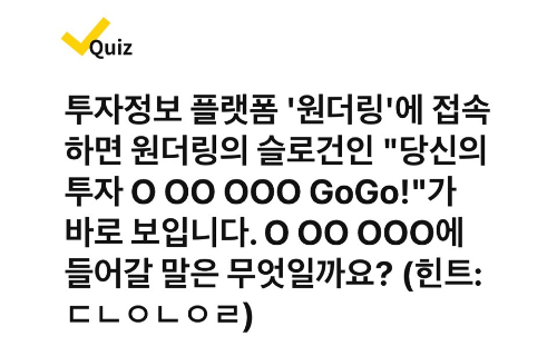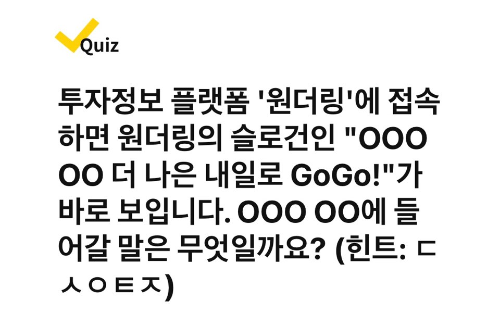 투자정보 플랫폼 '원더링'에 접속하면 원더링의 슬로건인 "OOOOO 더 나은 내일로 GoGo!"가 바로 보입니다. OOO OO에 들어갈 말은 무엇일까요? (힌트 : ㄷㅅㅇㅌㅈ)