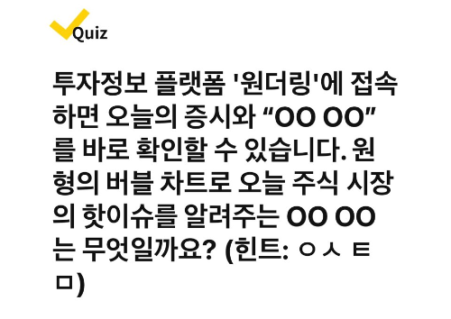 투자정보 플랫폼 '원더링'에 접속하면 오늘의 증시와 "OOOO"를 바로 확인할 수 있습니다. 원형의 버블 차트로 오늘 주식 시장의 핫이슈를 알려주는 OOOO는 무엇일까요? (힌트 : ㅇㅅㅌㅁ)