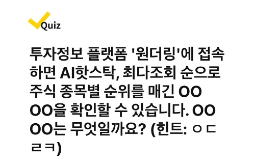투자정보 플랫폼 '원더링'에 접속하면 AI핫스탁, 최다조회 순으로 주식 종목별 순위를 매긴 OO OO을 확인할 수 있습니다. OO OO는 무엇일까요? (힌트: ㅇㄷ ㄹㅋ)