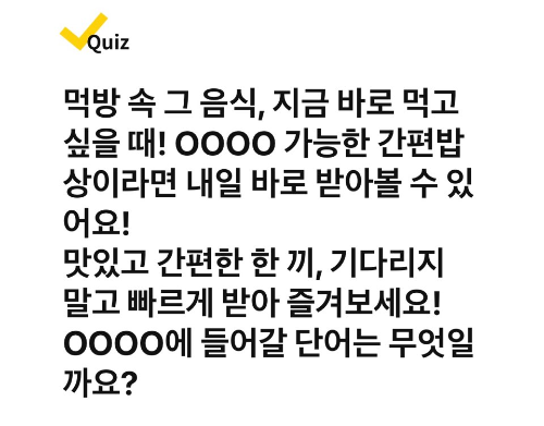 먹방 속 그 음식, 지금 바로 먹고 싶을 때! OOOO 가능한 간편밥상이라면 내일 바로 받아볼 수 있어요! 맛있고 간편한 한 끼, 기다리지 말고 빠르게 받아 즐겨보세요! OOOO에 들어갈 단어는 무엇일까요?