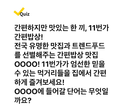 간편하지만 맛있는 한 끼, 11번가 간편밥상! 전국 유명한 맛집과 트렌드푸드를 선별해주는 간편밥상 맛집 OOOO! 11번가가 엄선한 믿을 수 있는 먹거리들을 집에서 간편하게 즐겨보세요! OOOO에 들어갈 단어는 무엇일까요?