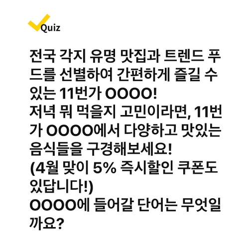 전국 각지 유명 맛집과 트렌드 푸드를 선별하여 간편하게 즐길 수 있는 11번가 OOOO! 저녁 뭐 먹을지 고민이라면, 11번가 OOOO에서 다양하고 맛있는 음식들을 구경해보세요! (4월 맞이 5% 즉시 할인 쿠폰도 있답니다!) OOOO에 들어갈 단어는 무엇일까요?