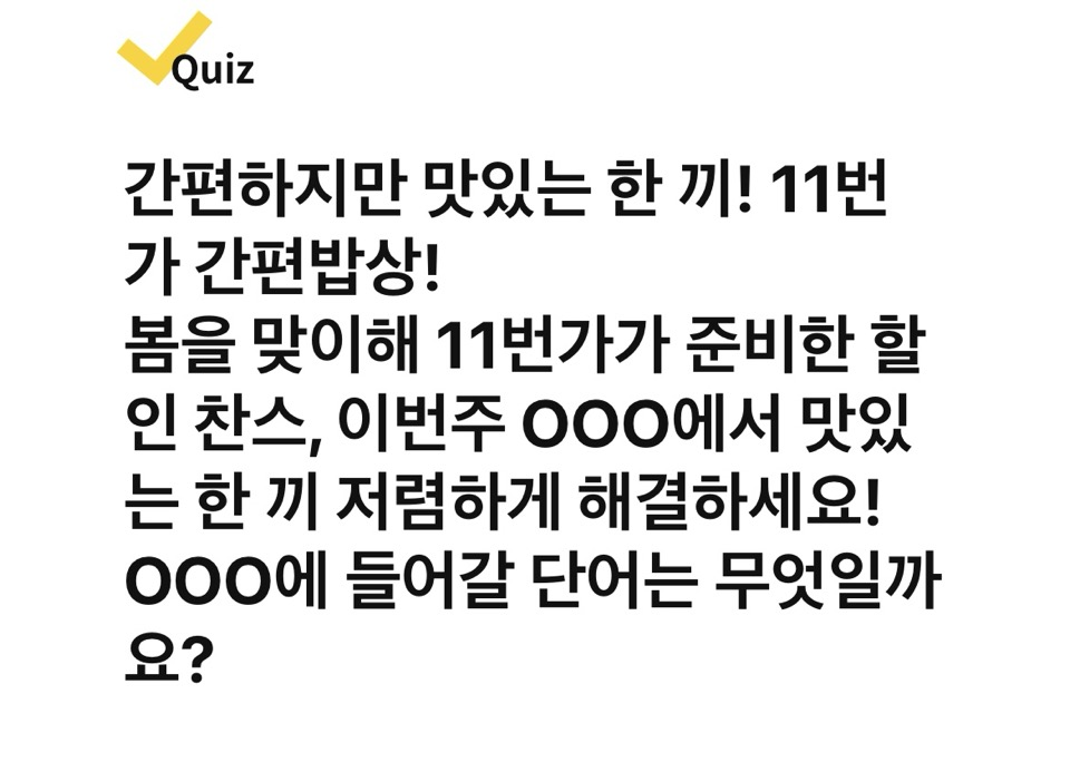 간편하지만 맛있는 한 끼! 11번가 간편밥상! 봄을 맞이해 11번가가 준비할 할인 찬스, 이번주 OOO에서 맛있는 한 끼 저렴하게 해결하세요! OOO에 들어갈 단어는 무엇일까요?