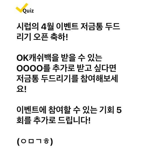시럽의 4월 이벤트 저금통 두드리기 오픈 축하! OK캐쉬백을 받을 수 있는 OOOO를 추가로 받고 싶다면 저금통 두드리기를 참여해보세요! 이벤트에 참여할 수 있는 기회 5회를 추가로 드립니다!