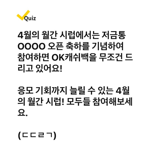 4월의 월간 시럽에서는 저금통 ㄷㄷㄹㄱ 오픈 축하를 기념하여 참여하면 OK캐쉬백을 무조건 드리고 있어요! 응모 기회까지 늘릴 수 있는 4월의 월간 시럽! 모두들 참여해보세요. (ㄷㄷㄹㄱ)