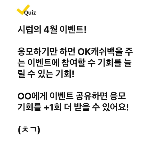 시럽의 4월 이벤트! 응모하기만 하면 OK캐쉬백을 주는 이벤트에 참여할 수 있는 기회를 늘릴 수 있는 기회! OO에게 이벤트 공유하면 응모 기횔ㄹ +1회 더 받을 수 있어요!