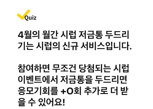 4월의 월간 시럽 저금통 두드리기는 시럽의 신규 서비스입니다. 참여하면 무조건 당첨되는 시럽 이벤트에서 저금통을 두드리면 응모기회를 +O회 추가로 더 받을 수 있어요!
