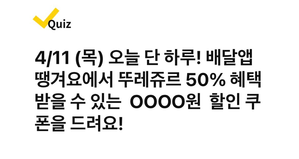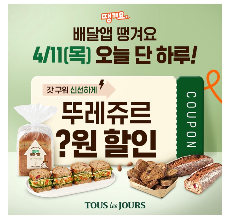 4/11(목) 오늘 단 하루! 배달앱 땡겨요에서 뚜레쥬르 50% 혜택 받을 수 있는 OOOO원 할인 쿠폰을 드려요!