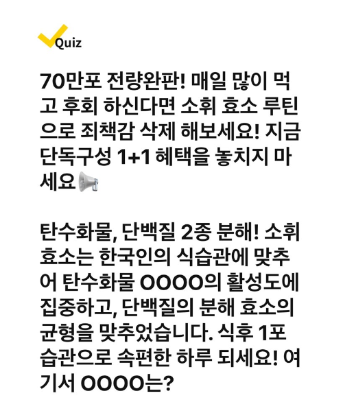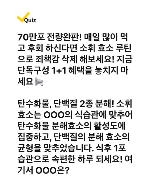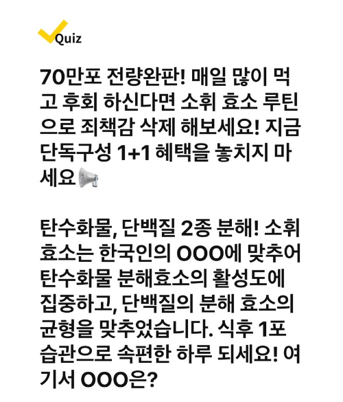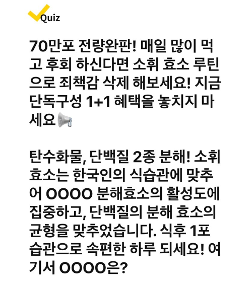 70만포 전량 완판! 매일 많이 먹고 후회하신다면 소휘 효소 루틴으로 죄책감 삭제 해보세요! 지금 단독구성 1+1 혜택을 놓치지 마세요. 탄수화물, 단백질 2종 분해! 소휘 효소는 한국인의 식습관에 맟추어 OOOO 분해효소의 활성도에 집중하고, 단백질의 분해 효소의 균형을 맞추었습니다. 식후 1포 습관으로 속편한 하루 되세요! 여기서 OOOO은?