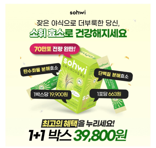 70만포 전량 완판! 매일 많이 먹고 후회하신다면 소휘 효소 루틴으로 죄책감 삭제 해보세요! 지금 단독구성 1+1 혜택을 놓치지 마세요. 탄수화물, 단백질 2종 분해! 소휘 효소는 OOO의 식습관에 맟추어 탄수화물분해효소의 활성도에 집중하고, 단백질의 분해 효소의 균형을 맞추었습니다. 식후 1포 습관으로 속편한 하루 되세요! 여기서 OOOO은?