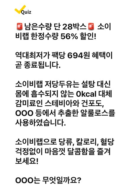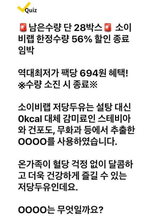 4월 13일 캐시워크 돈버는퀴즈 단 28박스 체중관리&식사대용 저당두유 소이비랩으로 당류와 OOO 걱정없이 단 28박스 체중관리&식사대용 저당두유 소이비랩 원액두유 함량을 OO.OO%까지 단 28박스 체중관리&식사대용 저당두유 소이비랩 스테비아와 건포도, 무화과 등에서 추출한 OOOO 단 28박스 체중관리&식사대용 저당두유 소이비랩 OOO OOO을 만들었어요 단 28박스 체중관리&식사대용 저당두유 소이비랩 OOO 등에서 추출한 알룰로스 정답을 아래에서 확인해보세요!
