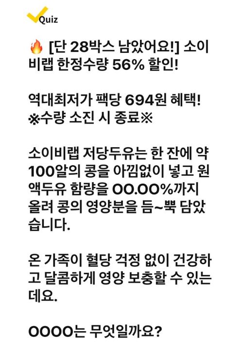 단 28박스 체중관리&식사대용 저당두유 소이비랩 단28박스 체중관리&식사대용 저당두유 캐시워크 돈버는퀴즈 정답은?