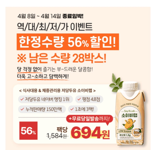 남은수량 단 28박스. 소이비랩 한정수량 56% 할인 종료 임박. 역대 최저가 팩당 694원 혜택! ※ 수량 소진 시 종료※