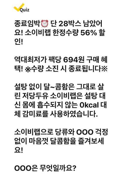 설탕 없이 달~콤함은 그대로 살린 저당두유 소이비랩은 설탕 대신 몸에 흡수뒤지 않는 0kcal 대체 감미료를 사용하였습니다. 소이비랩으로 당류와 OOO 걱정 없이 마음껏 달콤함을 즐겨보세요! OOO은 무엇일까요?