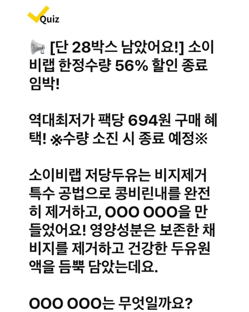 소이비랩 저당두유는 비지제거 특수 공법으로 콩비린내를 완전히 제거하고, OOO OOO을 만들었어요! 영양성분은 보존한 채 비지를 제거하고 건강한 두유원액을 듬뿍 담았는데요. OOO OOO는 무엇일까요?