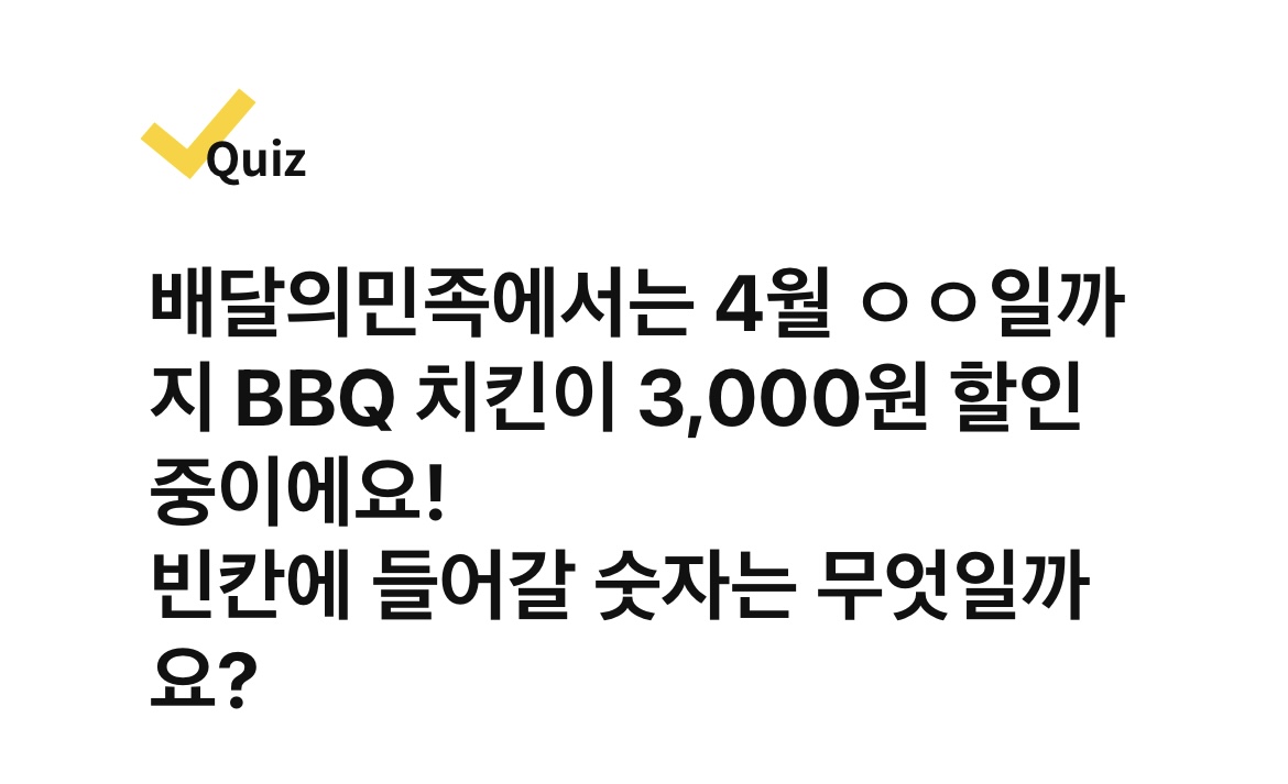 배달의민족에서는 4월 OO일까지 BBQ 치킨이 3,000원 할인 중이에요! 빈칸에 들어갈 숫자는 무엇일까요?