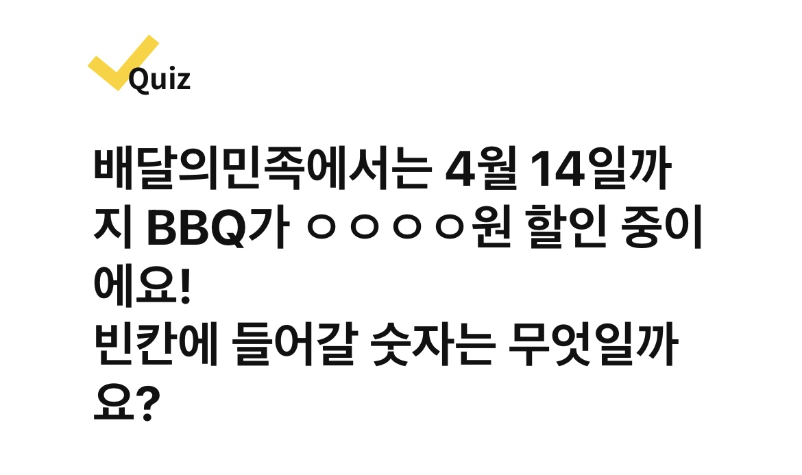 배달의민족에서는 4월 14일까지 BBQ가 OOOO원 할인 중이에요! 빈칸에 들어갈 숫자는 무엇일까요?