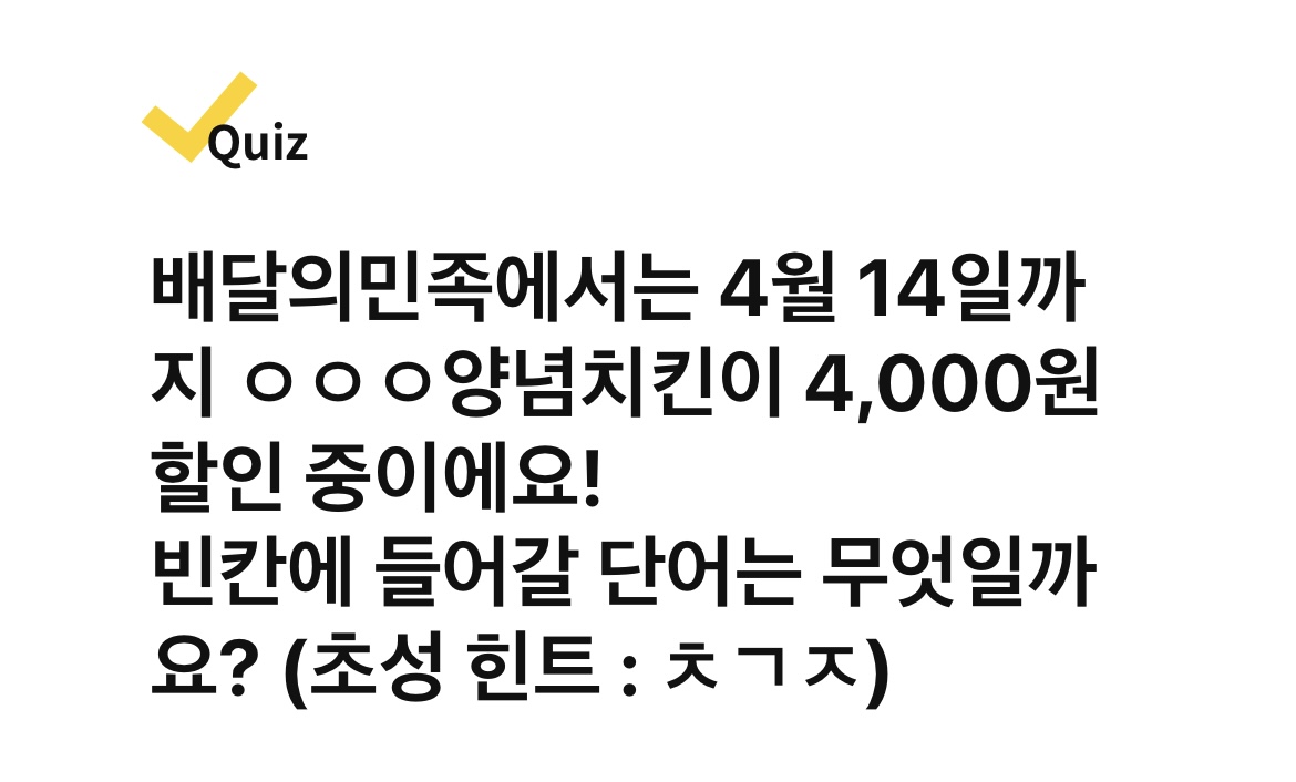 배달의민족에서는 4월 14일까지 OOO양념치킨이 4,000원 할인중이에요! 빈칸에 들어갈 단어는 무엇일까요? (초성힌트:ㅊㄱㅈ)
