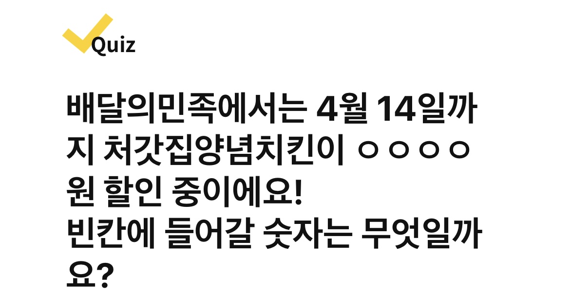 배달의민족에서는 4월 14일까지 처갓집양념치킨이 OOOO원 할인 중이에요! 빈칸에 들어갈 숫자는 무엇일까요?