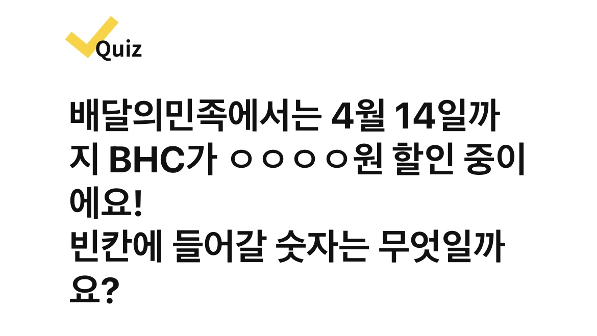 배달의민족에서는 4월 14일까지 BHC가 OOOO원 할인 중이에요! 빈칸에 들어갈 숫자는 무엇일까요?