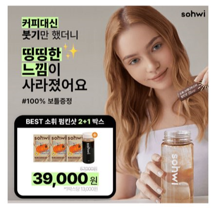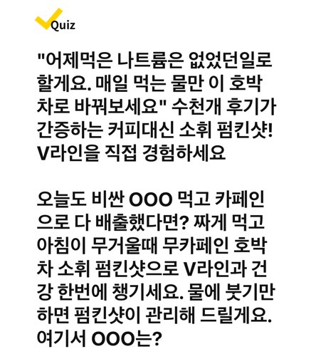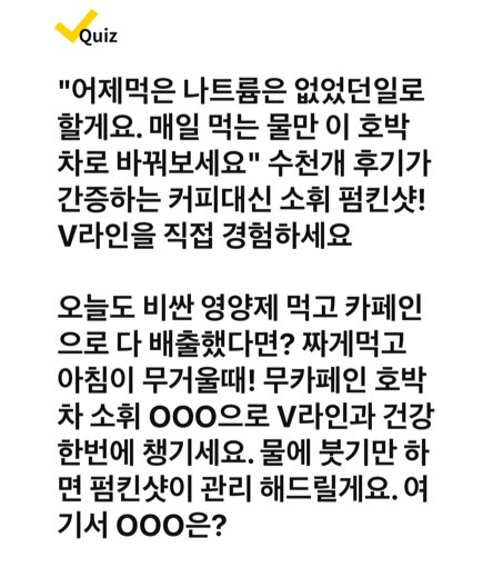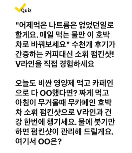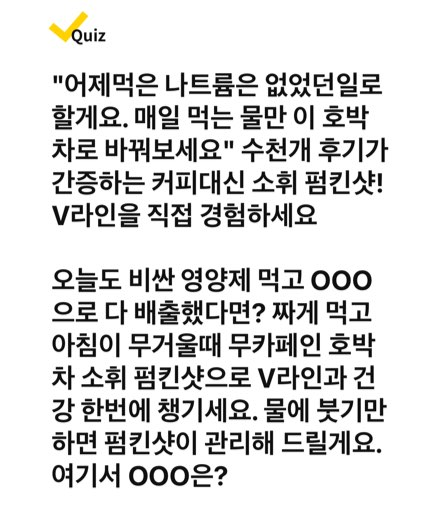 오늘도 비싼 영양제 먹고 카페인으로 다 배출했다면? 짜게 먹고 아침이 무거울때! 무카페인 호박차 소휘 OOO으로 V라인과 건강 한번에 챙기세요. 물에 붓기만 하면 펌킨샷이 관리 해드릴게요. 여기서 OOO은?