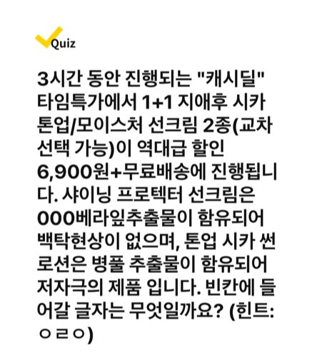 3시간 동안 진행되는 "캐시딜" 타임특가에서 1+! 지애후 시카 톤업/모이스처 선크림 2종(교차 선택 가능)이 역대급 할인 6900원+무료배송에 진행됩니다. 샤이닝 프로텍터 선크림은 OOO베라잎추출물이 함유되어 백탁현상이 없으며, 톤업 시카 썬로션은 병풀추출물이 함유되어 저자극의 제품입니다. 빈칸에 들어갈 글자는 무엇일까요? (힌트 : ㅇㄹㅇ)