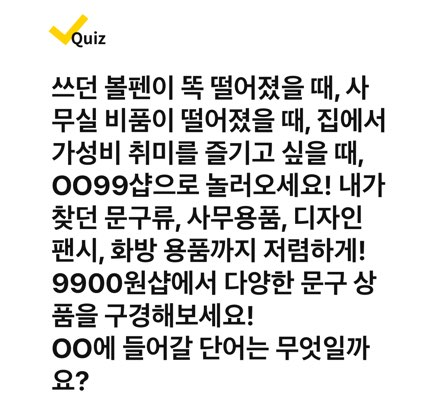 쓰던 볼펜이 똑 떨어졌을 때, 사무실 비품이 떨어졌을 때, 집에서 가성비 취미를 즐기고 싶을 때, OO99샵으로 놀러오세요! 내가 찾던 문구류, 사무용품, 디자인팬시, 화방 용품까지 저렴하게! 9900원샵에서 다양한 문구 상품을 구경해보세요! OO에 들어갈 단어는 무엇일까요?