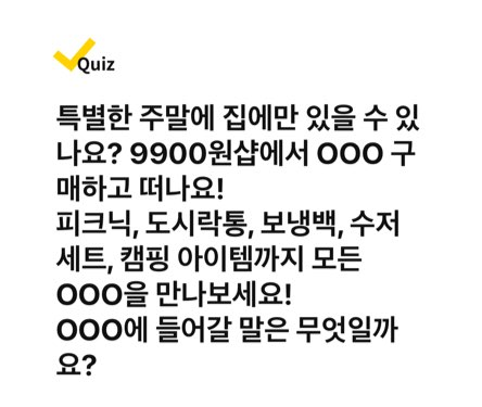 특별한 주말에 집에만 있을 수 있나요? 9900원샵에서 OOO 구매하고 떠나요! 피크닉, 도시락통, 보냉백, 수저세트, 캠핑 아이템까지 모든 OOO을 만나보세요! OOO에 들어갈 말은 무엇일까요?