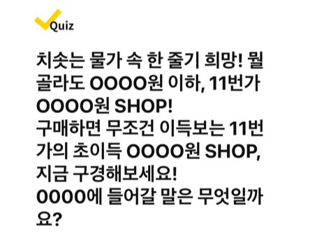 치솟는 물가 속 한 줄기 희망! 뭘 골라도 OOOO원 이하, 11번가 OOOO원 SHOP! 구매하면 무조건 이득보는 11번가의 초이득 OOOO원 SHOP 지금 구경해보세요! OOOO에 들어갈 말은 무엇일까요?