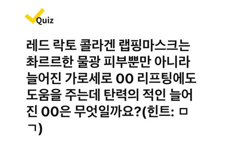레드 락토 콜라겐 랩핑마스크는 촤르르한 물광 피부뿐만 아니라 늘어진 가로세로 OO리프팅에도 도움을 주는데 탄력의 적인 늘어진 OO은 무엇일까요? (힌트 : ㅁㄱ)
