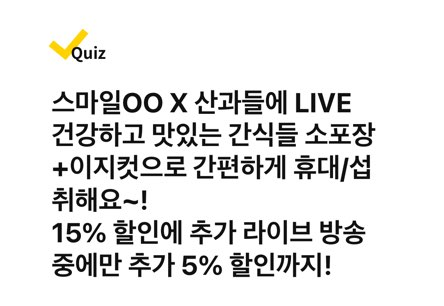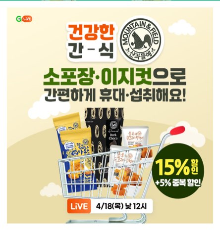 스마일OO X 산과들에 LIVE 건강하고 맛있는 간식들 소포장+이지컷으로 간편하게 휴대/섭취해요~! 15% 할인에 추가 라이브 방송중에만 추가 5% 할인까지!