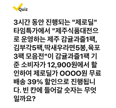 3시간동안 진행되는 "제로딜" 타임특가에서 "제주식품대전으로 운영하는 제주 감귤과즐 1팩, 김부각5팩, 딱새우라면5봉, 육포 3팩 모음전"이 감귤과즐 1팩 기준 소비자가 12,900원에서 할인하여 제로딜가 OOOO원 무료배송 39% 할인으로 진행됩니다. 빈 칸에 들어갈 숫자는 무엇일까요?