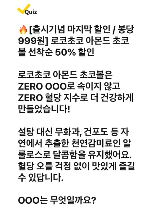 [출시기념 마지막 할인 / 봉당 999원] 로코초코 아몬드 초코볼 선착순 50% 할인. 로코초코 아몬드 초코볼은 ZERO OOO로 속이지 않고 ZERO 혈당 지수로 더 건강하게 만들었습니다! 설탕 대신 무화과, 건포도 등 자연에서 추출한 천연감미료인 알룰로스로 달콤함을 유지했어요. 혈당 오를 걱정 없이 맛있게 즐길 수 있답니다. OOO는 무엇일까요?