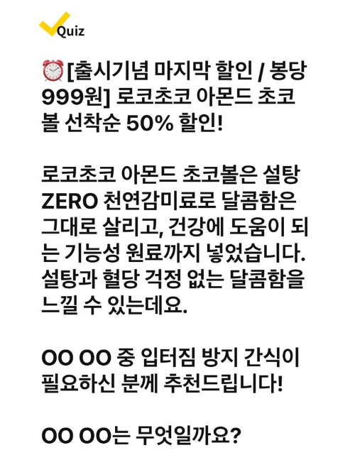 [출시기념 마지막 할인 / 봉당 999원] 로코초코 아몬드 초코볼 선착순 50% 할인! 로코초코 아몬드 초코볼은 설탕 ZERO 천연감미료로 달콤함은 그대로 살리고, 건강에 도움이 되는 기능성 원료까지 넣었습니다. 설탕과 혈당 걱정 없는 달콤함을 느낄 수 있는데요. OO OO 중 입터짐 방지 간식이 필요하신 분께 추천드립니다! OO OO는 무엇일까요?