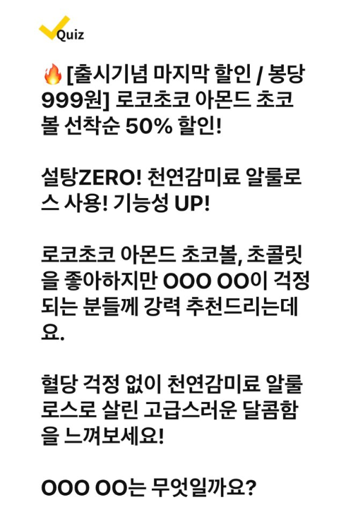 [출시기념 마지막 할인 / 봉당 999원] 로코초코 아몬드 초코볼 선착순 50% 할인! 설탕ZERO! 천연감미료 알룰로스 사용! 기능성 UP! 로코초코 아몬드 초코볼, 초콜릿을 좋아하지만 OOO OO이 걱정되는 분들께 강력 추천드리는데요. 혈당 걱정 없이 천연감미료 알룰로스로 살린 고급스러운 달콤함을 느껴보세요! OOO OO는 무엇일까요?