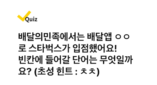 배달의민족에서는 배달앱 OO로 스타벅스가 입접했어요! 빈칸에 들어갈 단어는 무엇일까요? (초성 힌트 : ㅊㅊ)