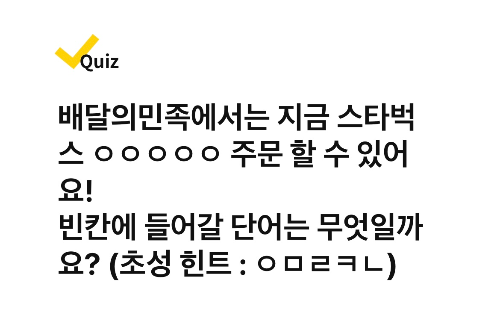 배달의민족에서는 지금 스타벅스 OOOOO 주문 할 수 있어요! 빈칸에 들어갈 단어는 무엇일까요? (초성 힌트 : ㅇㅁㄹㅋㄴ)