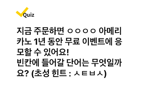 지금 주문하면 OOOO 아메리카노 1년 동안 무료 이벤트에 응모할 수 있어요! 빈칸에 들어갈 단어는 무엇일까요? (초성 힌트 : ㅅㅌㅂㅅ)