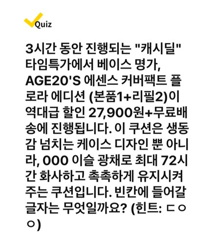 3시간동안 진행되는 "캐시딜" 타임특가에서 베이스 명가, AGE29'S 에센스 커버팩트 플로라 에디션 (본품1+리필2)이 역대급할인 27,900원+무료배송에 진행됩니다. 이 쿠션은 생동감 넘치는 케이스 디자인 뿐 아니라, OOO 이슬 광채로 최대 72시간 화사하고 촉촉하게 유지시켜주는 쿠션입니다. 빈칸에 들어갈 글자는 무엇일까요? (힌트: ㄷㅇㅇ)