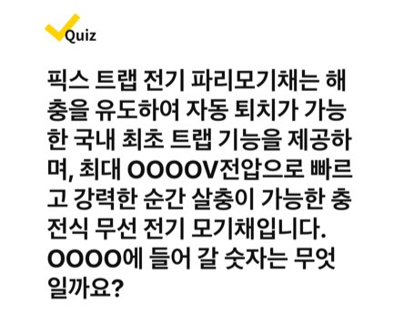 픽스 트랩 전기 파리 모기채는 해충을 유도하여 자동 퇴치가 가능한 국내 최초 트랩 기능을 제공하며, 최대 OOOOV전압으로 빠르고 강력한 순간 살충이 가능한 충전식 무선 전기 모기채입니다. OOOO에 들어갈 숫자는 무엇일까요?