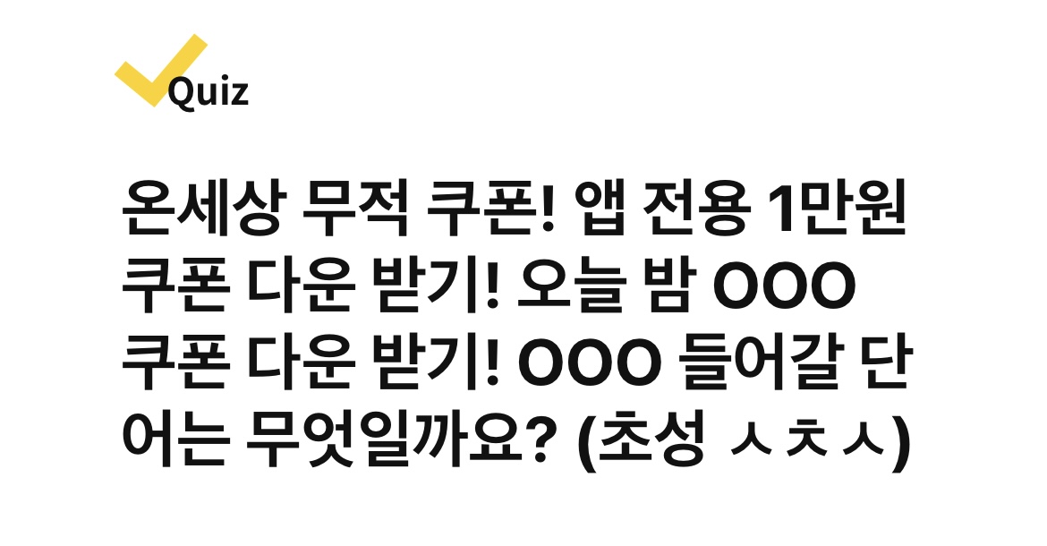 온세상 무적 쿠폰! 앱 전용 1만원 쿠폰 다운 받기! 오늘 밤 OOO쿠폰 다운 받기! OOO 들어갈 단어는 무엇일까요? (초성 ㅅㅊㅅ)