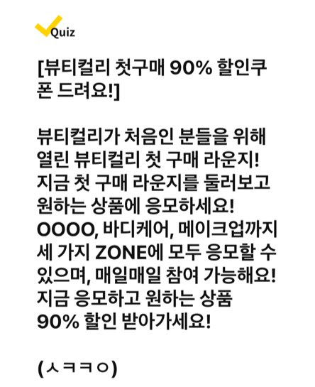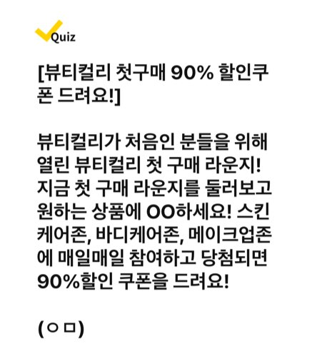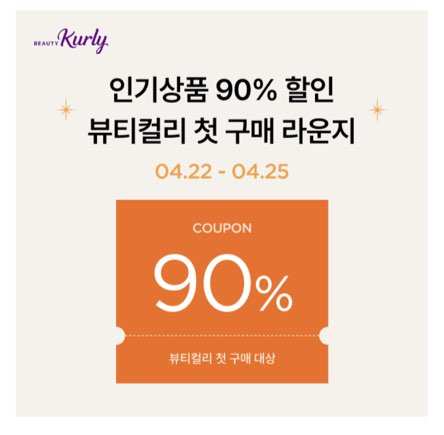 [뷰티컬리 첫구매 90% 할인쿠폰 드려요!] 뷰티컬리가 처음인 분들을 위해 열린 뷰티컬리 첫 구매 라운지! 지금 첫 구매 라운지를 둘러보고 원하는 상품에 응모하세요! 스킨케어, OOOO, 메이크업까지 세 가지 ZONE에 모두 응모할 수 있으며, 매일매일 참여 가능해요! 지금 응모하고 원하는 상품 90% 할인 받아가세요! (ㅂㄷㅋㅇ)