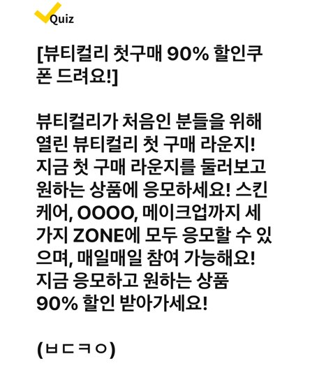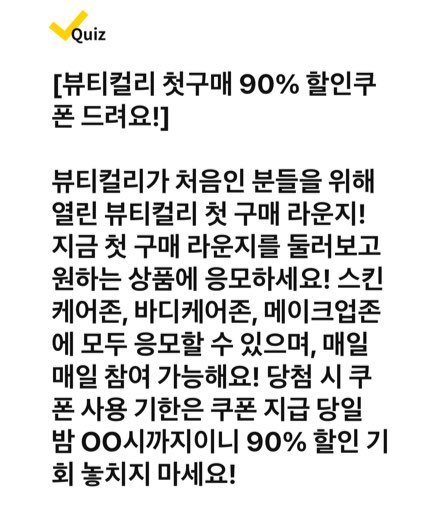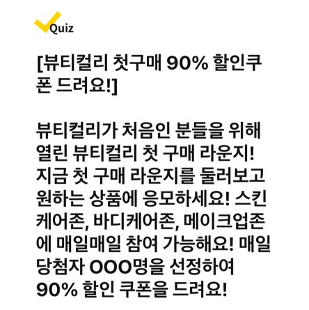 [뷰티컬리 첫구매 90% 할인쿠폰 드려요!] 뷰티컬리가 처음인 분들을 위해 열린 뷰티컬리 첫 구매 라운지! 지금 첫 구매 라운지를 둘러보고 원하는 상품에 응모하세요! OOOO, 바디케어, 메이크업까지 세 가지 ZONE에 모두 응모할 수 있으며, 매일매일 참여 가능해요! 매일 당첨자 OOO명을 선정하여 90% 할인 쿠폰을 드려요!