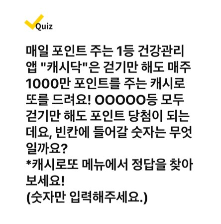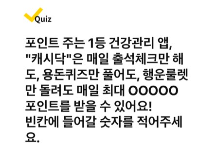 포인트 주는 1등 건강관리 앱 "캐시닥"은 매일 출석체크만 해도, 용돈퀴즈만 풀어도, 행운룰렛만 돌려도 매일 최대 OOOOO포인트를 받을 수 있어요! 빈칸에 들어갈 숫자를 적어주세요.