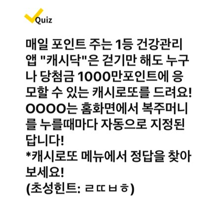 매일 포인트 주는 1등 건강관리 앱 "캐시닥"은 걷기만 해도 누구나 당첨금 1000만포인트에 응모할 수 있는 캐시로또를 드려요! OOOO는 홈화면 복주머니를 누를때마다 자동으로 지정된답니다! *캐시로또 메뉴에서 정답을 찾아보세요! (초성힌트 : ㄹㄸㅂㅎ)