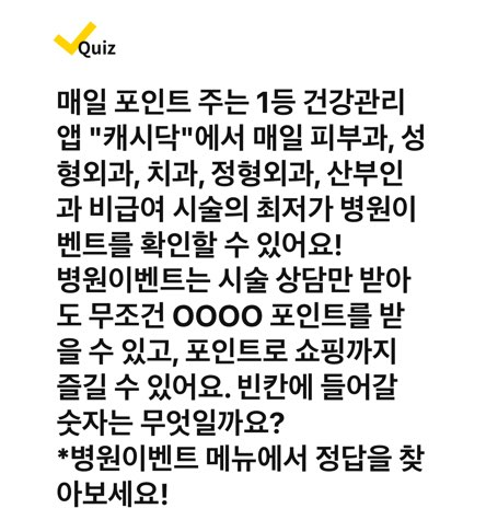 매일 포인트 주는 1등 건강관리앱 "캐시닥"에서 매일 피부과, 성형외과, 치과, 정형외과, 산부인과 비급여 시술의 최저가 병원 이벤트를 확인할 수 있어요! 병원이벤트는 시술 상담만 받아도 무조건 OOOO 포인트를 받을 수 있고, 포인트로 쇼핑까지 즐길 수 있어요. 빈칸에 들어갈 숫자는 무엇일까요? *병원이벤트 메뉴에서 정답을 찾아보세요!