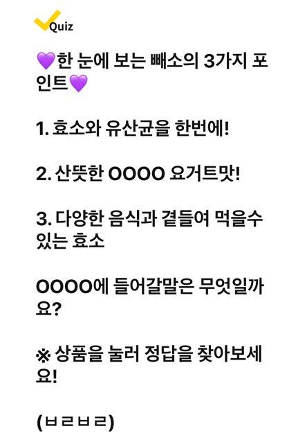 💜 한눈에 보는 빼소의 3가지 포인트💜 1. 효소와 유산균을 한번에! 2. 산뜻한 OOOO 요거트맛! 3. 다양한 음식과 곁들여 먹을 수 있는 효소 OOOO에 들어갈 말은 무엇일까요? (ㅂㄹㅂㄹ)
