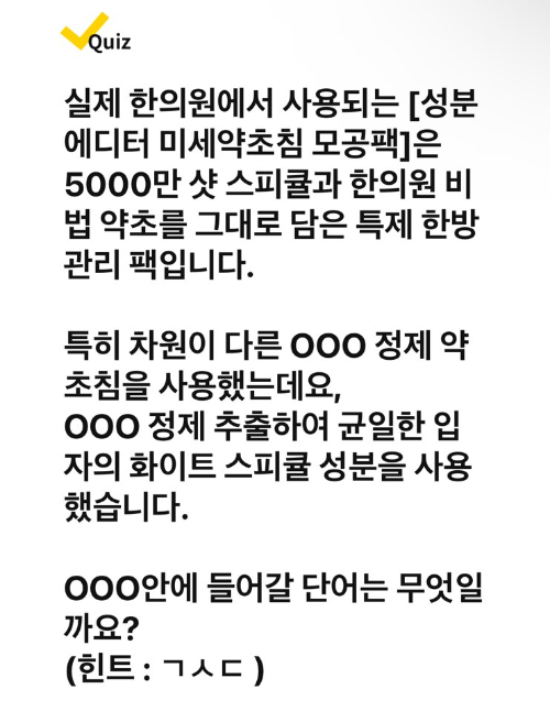 실제 한의원에서 사용되는 [성분에디터 미세약초침 모공팩]은 5000만 샷 스피큘과 한의원 비법 약초를 그대로 담은 특제 한방 관리 팩입니다. 특히 차원이 다른 OOO 정제 약초침을 사용했는데요, OOO 정제 추출하여 균일한 입자의 화이트 스피큘 성분을 사용했습니다. OOO안에 들어갈 단어는 무엇일까요? (힌트 : ㄱㅅㄷ)