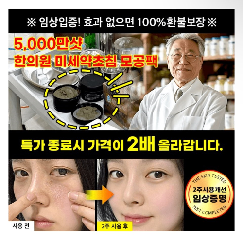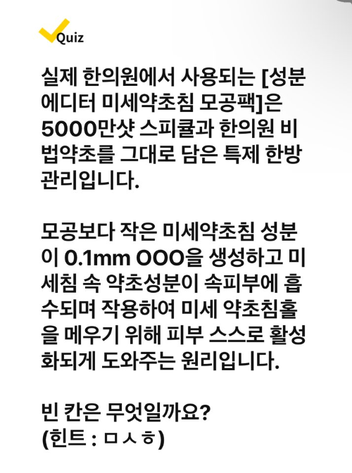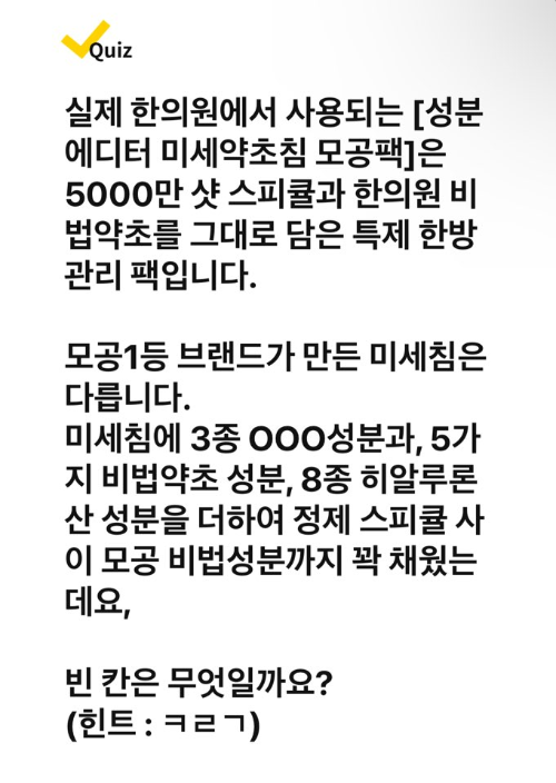 실제 한의원에서 사용되는 [성분에디터 미세약초침 모공팩]은 5000만 샷 스피큘과 한의원 비법 약초를 그대로 담은 특제 한방 관리 팩입니다. 모공1등 므랜드가 만든 미세침은 다릅니다. 미세침에 3종 OOO성분과, 5가지 비법약초 성분, 8종 히알루론산 성분을 더하여 정제 스피큘 사이 모공 비법성분까지 꽉 채웠는데요, 빈칸은 무엇일까요? (힌트: ㅋㄹㄱ)