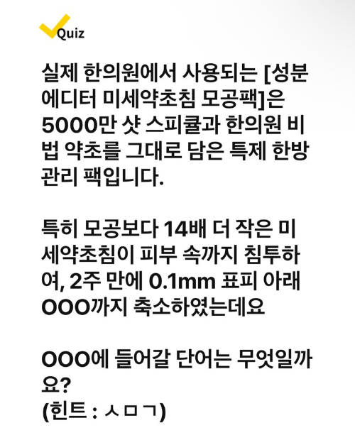 실제 한의원에서 사용되는 [성분에디터 미세약초침 모공팩]은 5000만 샷 스피큘과 한의원 비법 약초를 그대로 담은 특제 한방 관리 팩입니다. 특히 모공보다 14배 더 작은 미세약초침이 피부 속까지 침투하여, 2주만에 0.1mm 표피 아래 OOO까지 축소하였는데요. OOO에 들어갈 단어는 무엇일까요? (힌트 : ㅅㅁㄱ)